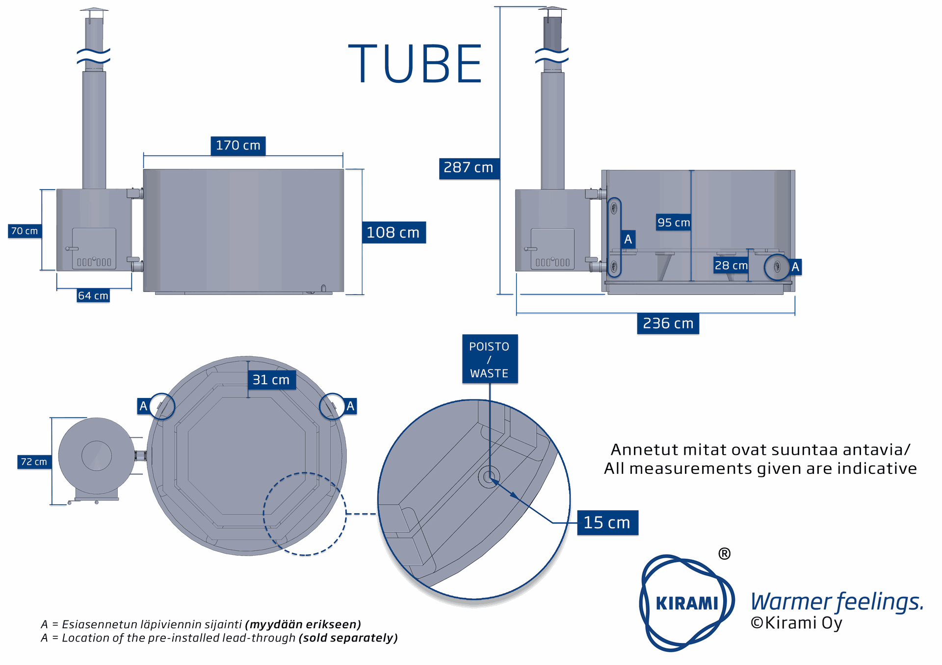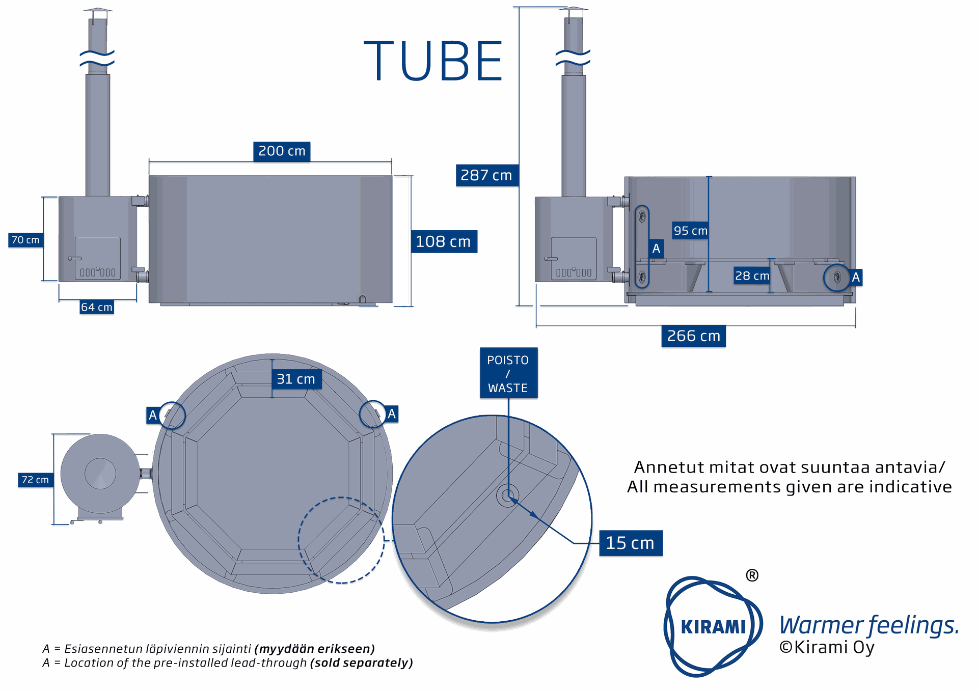 TUBE Ofen 60 kW: Der Ofen TUBE ist mit 60 kW unser leistungsstärkster Ofen. Durch seinen rötlichen Farbton harmoniert er perfekt mit dem natürlichen Holzton unserer Badefässer aus Thermokiefer und durch seine runde Form ergänzt er sich mit der Form des Badefasses. Ein Aschebehälter befindet sich unter dem Brennraum. Sämtliche unserer Öfen werden aus Marine-Aluminium gefertigt und sind daher auch salzwassertauglich. Aufgrund der natürlichen Gesetzmäßigkeiten zirkuliert das Wasser durch im Ofen integrierte Rohre und es wird somit keine zusätzliche Pumpe benötigt. Heizleistung: Anstieg von 34 Grad / pro 1000 Liter Wasser / pro Stunde